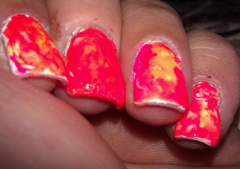 I then used the polishes in the picture below by putting but a couple drop of each color on my nail and then swirling it around with a toothpick. This was definitely wayyyyy cleaner than the water marbling, but I don't think it really looks all the similar either, unless I just did it wrong???